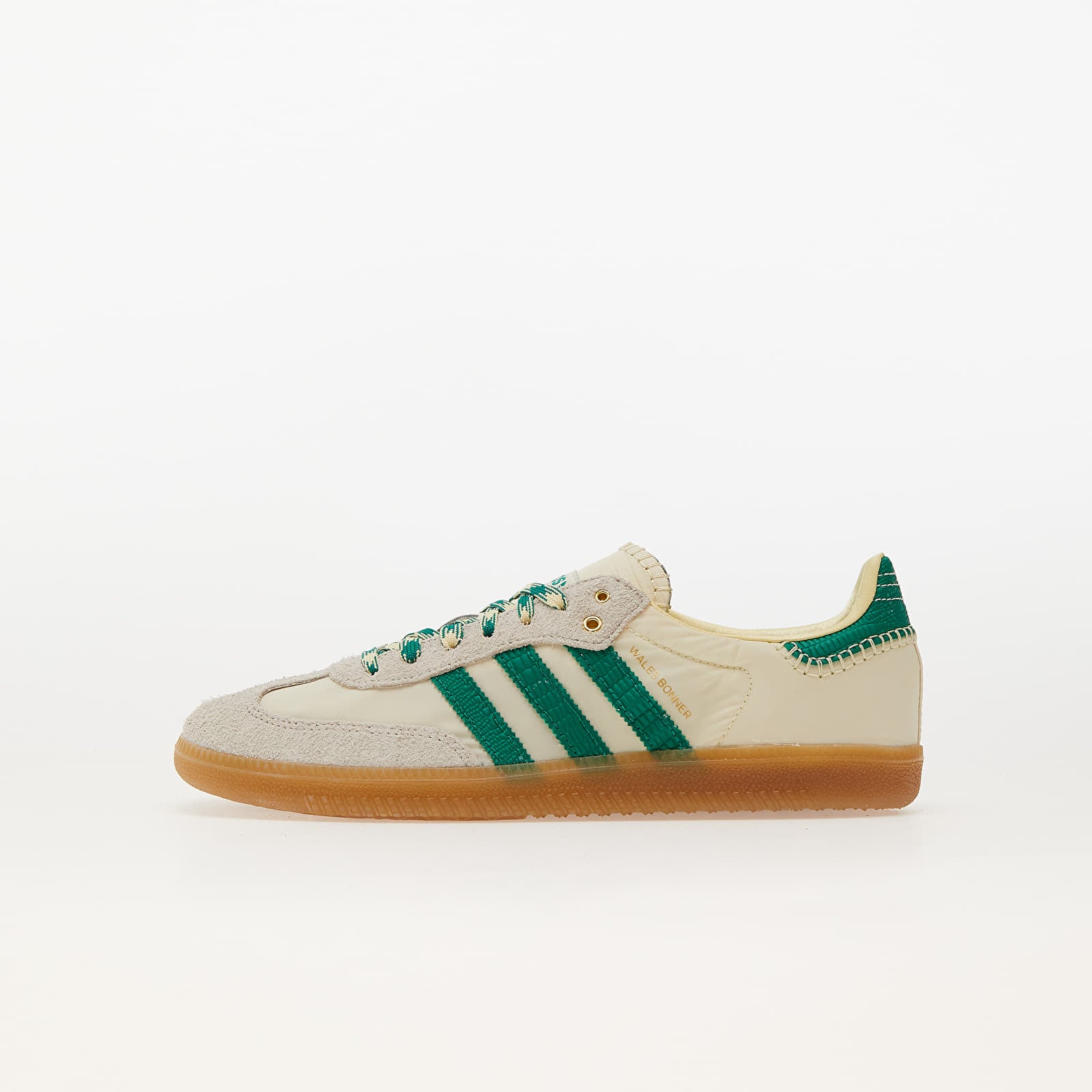 Light colors bring a fresh touch while the dark green adds visual depth. The gum soles perfectly complement the vintage look of the sneaker. Subtle details such as the engraved name of the designer on the laces and the embroidered Samba Wales Bonner logo on the heel add exclusivity to this iconic shoe. Crafted from high-quality materials, this sneaker ensures optimal comfort with its EVA midsole and rubber outsole.