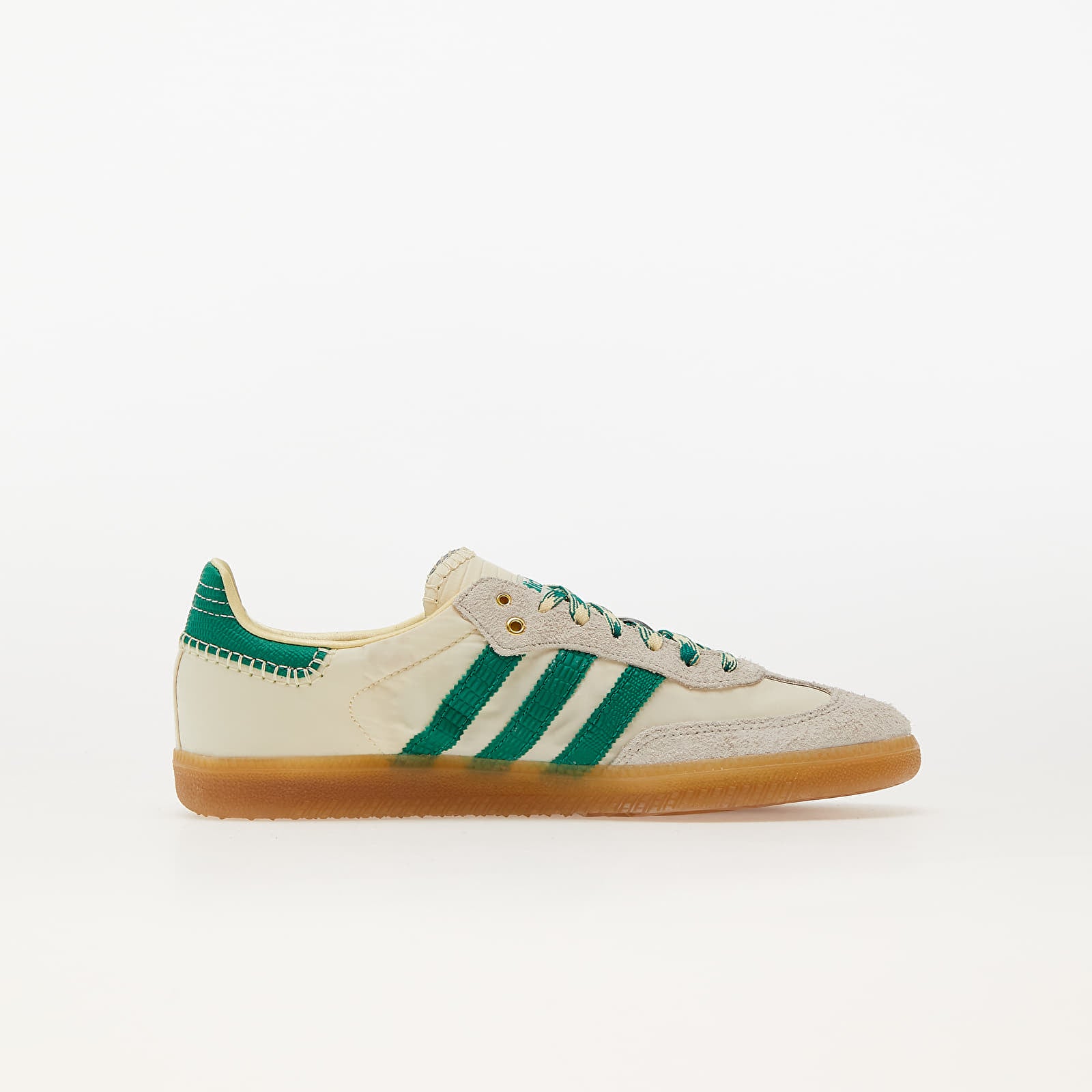 The Samba Wales Bonner Cream Green sneaker is a tribute to rich heritage and an innovative collaboration with designer Grace Wales Bonner. Drawing inspiration from the football legacy of the Samba, this version is updated with a contemporary aesthetic and unique details. The Cream/Green/Gum colorway offers a striking and elegant contrast, highlighting various textures and materials.